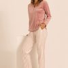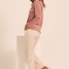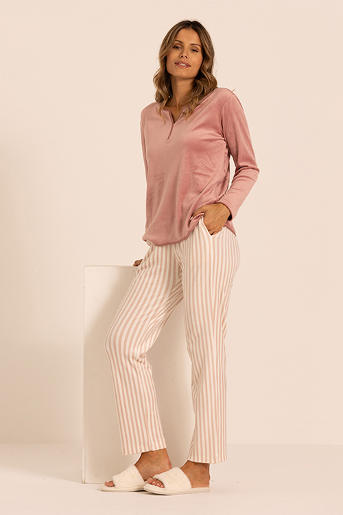 Completo lungo invernale da donna con maglia a maniche lunghe, profilato sul fondo e sul collo in raso in tono. Il pantalone è lungo con tasche sul fianco e stampato con un elegante bastoncino color rosa antico su fondo bianco naturale. Il tessuto è un velour stretch ideale per le mezze stagioni, particolarmente morbido al tatto, piacevole da indossare ed estremamente confortevole grazie ad una innata elasticità.