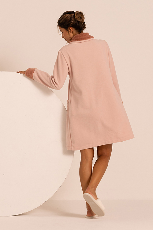 Vestaglia in pile aperta con bottoni con inserti in pelliccia su collo e polsi e piping bicolore in raso sulle tasche. E’ un capo dalla vestibilità quasi sartoriale con leggero arriccio sulle spalle, taglio sotto il seno e piccole pinces come fosse un cappottino dal gusto retrò. La sensazione di avvolgersi in questa vestaglia è piacevole e accogliente grazie al nostro pile che non ha bisogno di presentazioni. Lunghezza 90 cm.