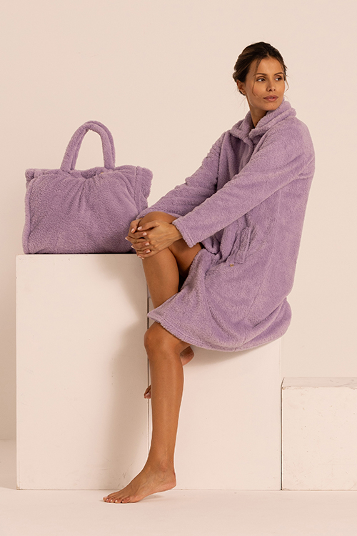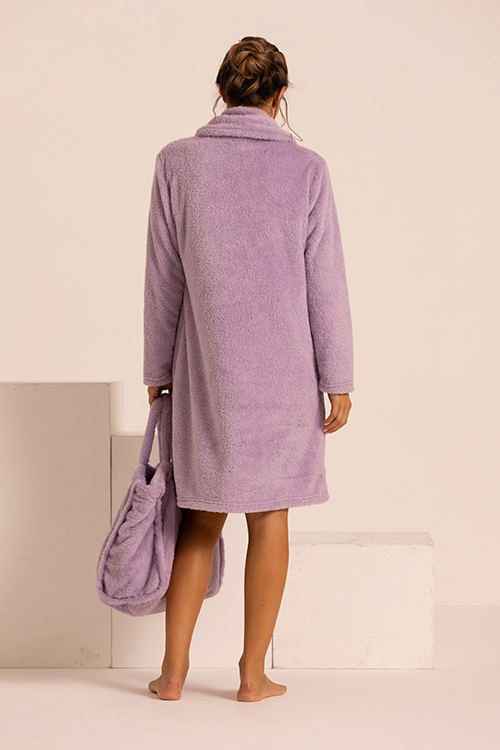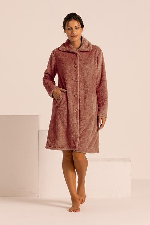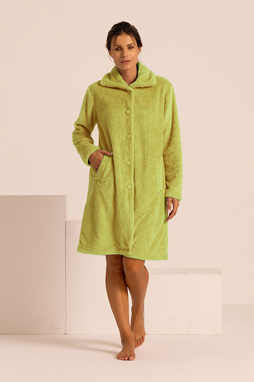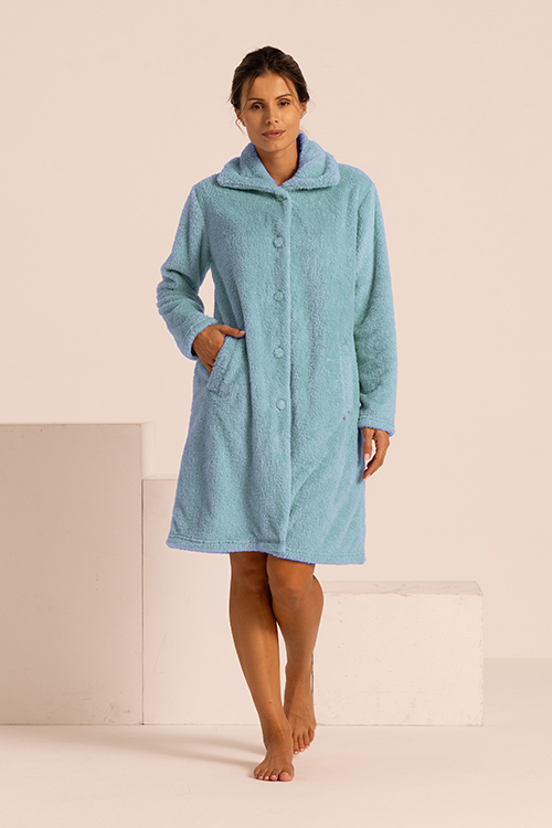 Vestaglia in orsetto con bottoni ideale per offrire massimo comfort nel periodo invernale. Dalla vestibilità ampia e rilassata, permette di muoversi liberamente in casa con una sensazione piacevole e accogliente. Proposta nei colori dei sorbetti si può abbinare con i nostri completi in collezione divertendosi con accostamenti nuovi e frizzanti. In linea con le proposte moda per questo inverno questo capo permette un uso esternabile. Lunghezza 95 cm.
