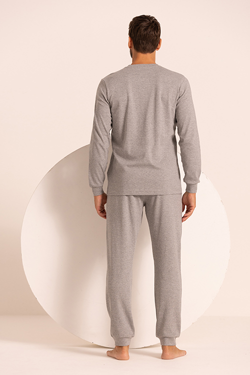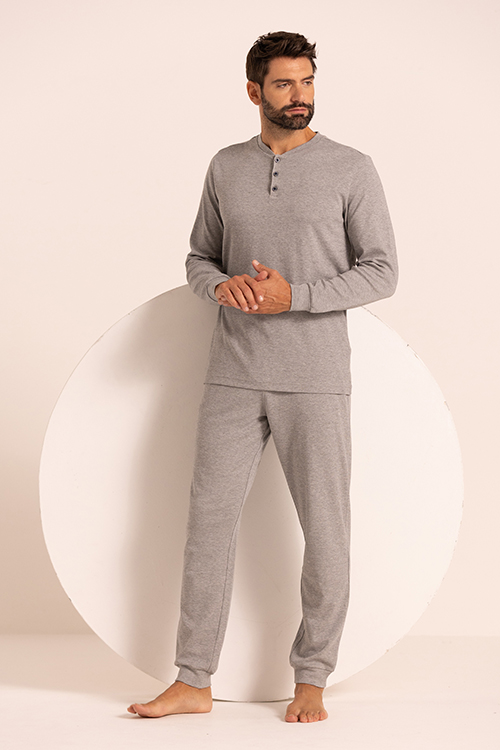 Pigiama uomo aperto con bottoni e polsi su maniche e pantaloni. Confortevole e morbido è perfetto per notti di sonno tranquillo o per giornate di ozio sul divano. Composizione: Interlock garzato internamente 100%CO.