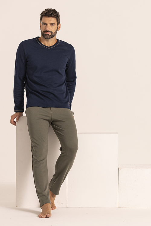 Pigiama in Interlock con maglia colore navy con scollo a V e dettagli piping verde militare su collo e fondo manica.