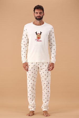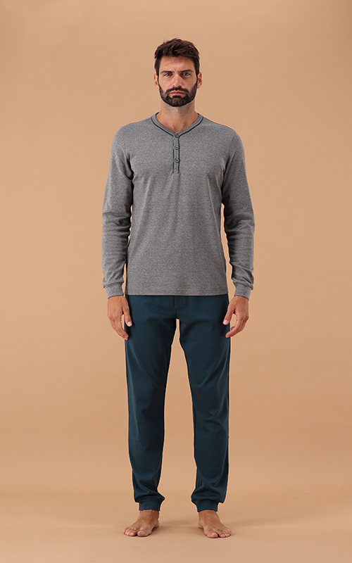 Pigiama da uomo in tessuto melange con collo serafino dal design particolare e scollatura con piccoli bottoni, ideale per un look rilassato ma sofisticato grazie anche al piping abbinato al pantalone. La stampa del logo a petto in rilievo è un altro elemento distintivo: che aggiunge personalità al pigiama. Il pantalone in contrasto si abbina perfettamente alla maglia ed è dotato di elastico in vita e tasche alla francese per il massimo comfort e libertà di movimento durante il riposo e polso sul fondo. Nel complesso, questo pigiama unisce eleganza e funzionalità, perfetto per l’uomo che apprezza lo stile anche nei momenti di relax.