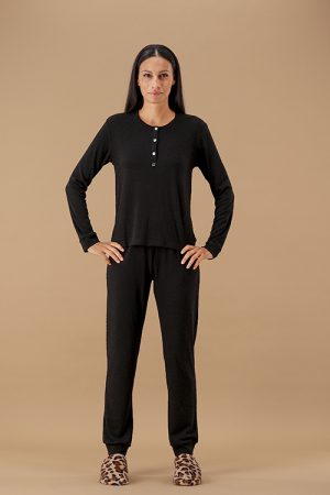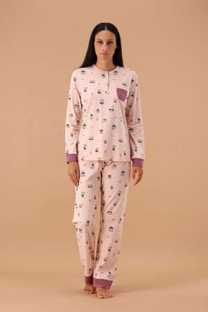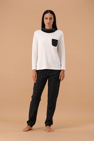 Pigiama realizzato in tessuto interlock melange, un materiale morbido e confortevole con collo a giro rifinito con un piping a contrasto che mette in risalto i dettagli della scollatura. Sul davanti c’è una stampa tono su tono del logo, discreta ma elegante. Il pantalone ha un fondo dritto ed è anch’esso in tessuto melange stampato con motivo a quadri in una combinazione di colori che include mogano e turchese, offrendo un look vivace e moderno. L’insieme crea un pigiama elegante ma confortevole, adatto a chi cerca stile anche nei capi da casa.