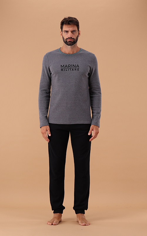 Pigiama in punto Milano che combina stile contemporaneo e comfort grazie al suo tessuto di alta qualità prodotto presso i nostri stabilimenti europei. La maglia, realizzata in tessuto melange, offre una texture ricca e sfumata, aggiungendo profondità visiva al capo. Il piping in contrasto sul girocollo dona un tocco di eleganza sportiva, creando un raffinato dettaglio di colore che arricchisce il design complessivo. Un altro elemento distintivo è il logo stampato in contrasto sul petto, che aggiunge un accento moderno e casual, rendendo il pigiama ideale anche per l’abbigliamento da casa con un tocco di personalità. Il pantalone, dallo stile confortevole, presenta un polso alla caviglia, che garantisce una vestibilità comoda e sicura. La coulisse in vita con dettagli colorati in contrasto aggiunge un ulteriore elemento di praticità e stile, permettendo di regolare la vestibilità e donando un look più dinamico e sportivo.