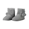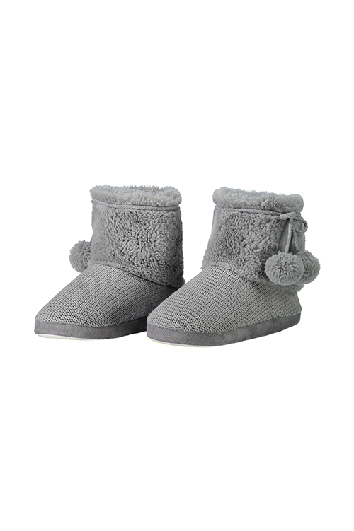 Stivaletto caldo in maglieria con punto particolare abbinato a una calda pelliccetta esterna ed interna. Divertenti pompon sono applicati con un fiocco in fettuccia tubolare. La suola è in gomma antiscivolo.