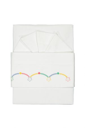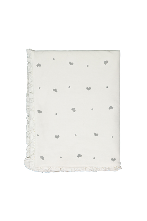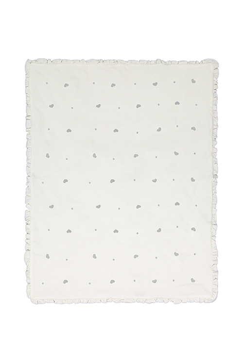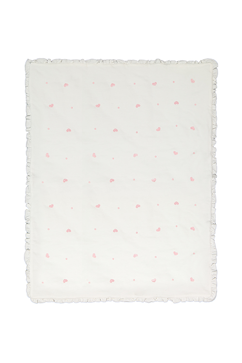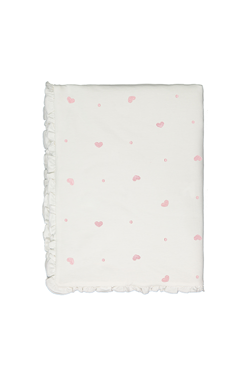 Trapuntino misura carrozzina in felpa ricamata a cuori e pois. Impreziosito da piccola rouches sul bordo è un peso intermedio perfetto per le giornate capricciose.