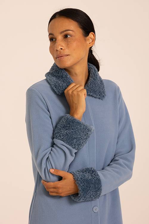 Vestaglia in pile medio peso con bottoni arricchita da inserti in pelliccia effetto morbido agnellino su collo, maniche, polsi e fondo. Elegantissima e calda è perfetta per essere utilizzata dentro e fuori casa. Lunghezza 90 cm.