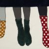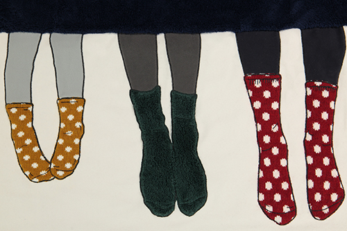 Questa coperta in Bussy blu navy, con un soffice rimesso al fondo in pile bianco naturale, unisce comfort e originalità. Il ricamo dettagliato e le applicazioni di calze dai diversi pattern danno vita a un design spiritoso e accogliente, simile a piedi che spuntano scherzosamente da sotto la coperta. Perfetta per chi ama i dettagli unici, è ideale per aggiungere un tocco di calore e personalità alla tua casa. Disponibile in misura 150×180 cm, è un complemento decorativo che non passa inosservato.